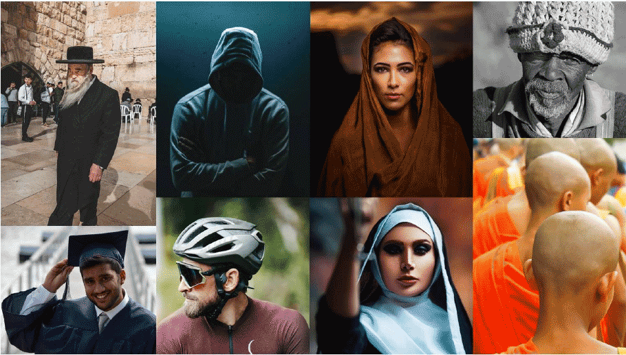 It also manifests itself in how humans want to present themselves, in particular dressing to signal a certain “image” for others to recognize. The images below illustrate differences in different contexts, i.e. dress codes are for instance obligatory in certain religions, and in the case for sportswear, ceremonial outfits and in some subcultures.