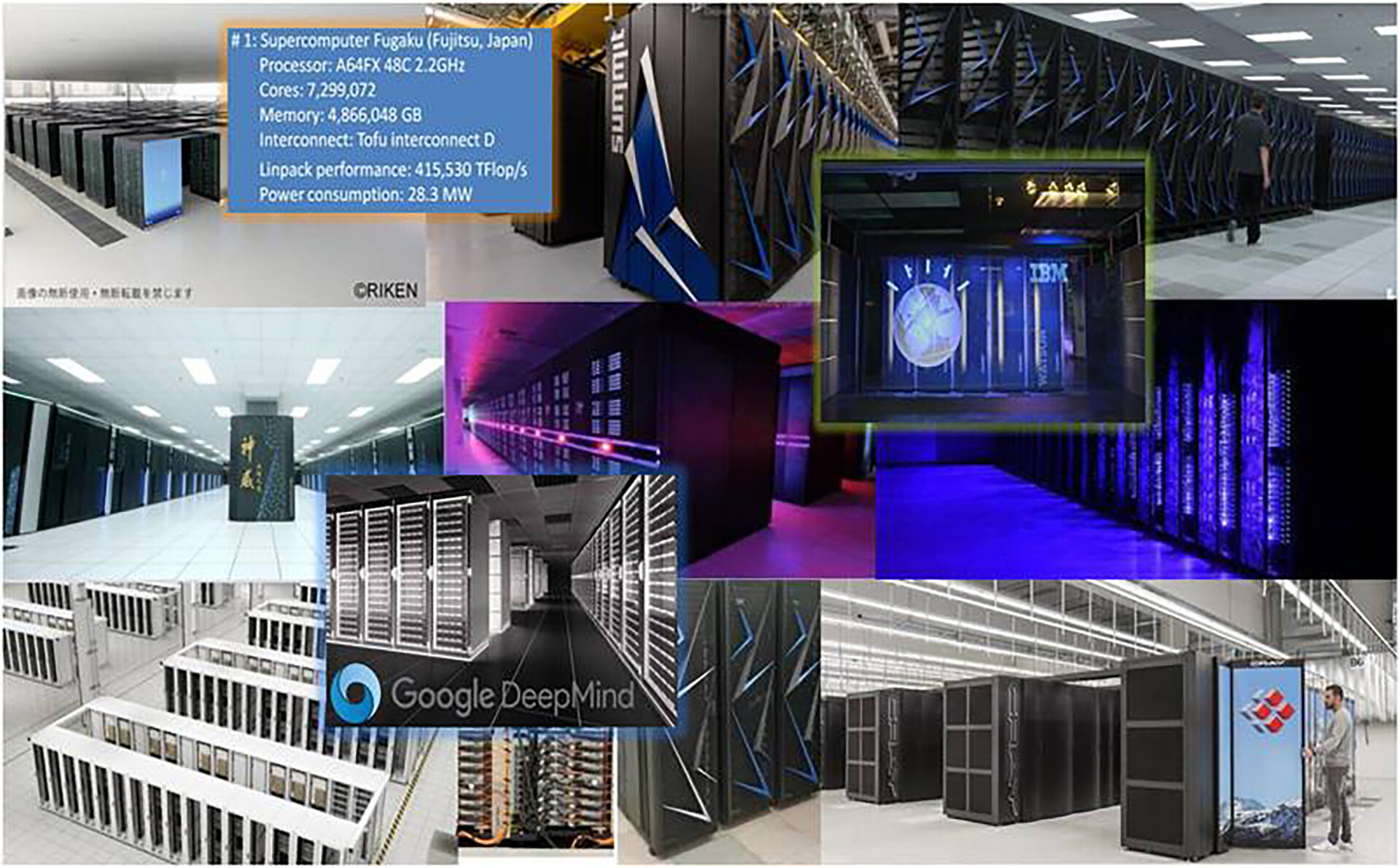 The images above are presented in the preferred human style of top 1-10 listings by starting top left and going horizontal and are ranked in terms of their performance in flops: You know, how fast they do calculations. I put in the AI-computers DeepMind and Watson from Google and IBM because they are the best known in public, but actually not the largest, and I haven’t included the work going on Quantum computers.